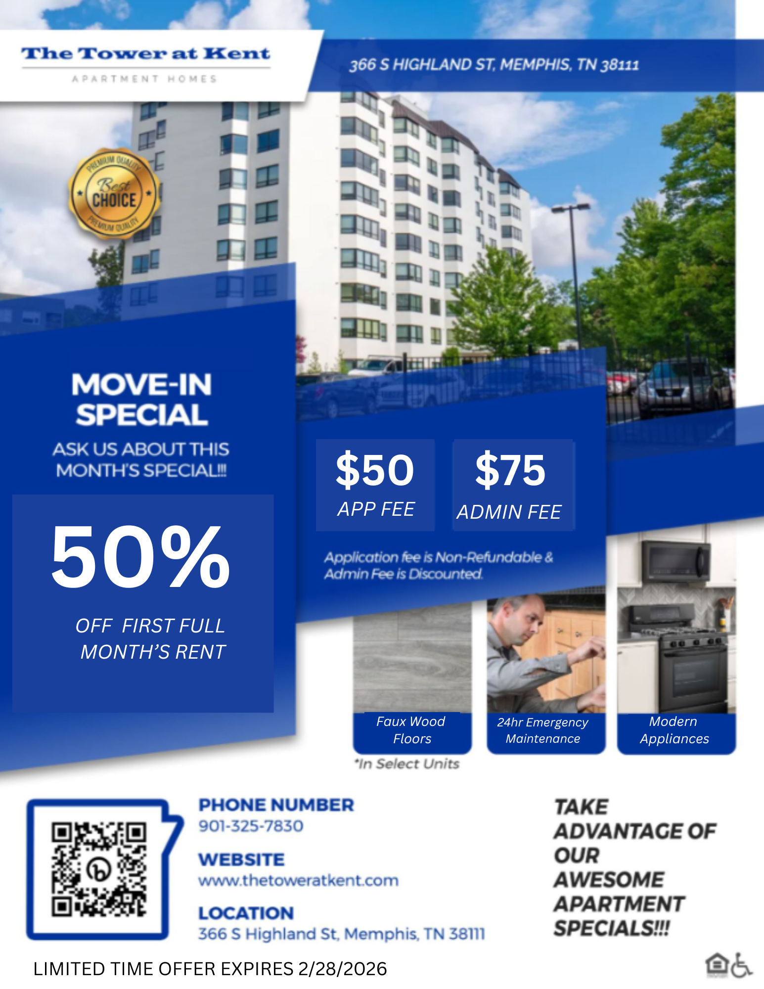 In the southwest part of Tennessee, you will find beautiful apartment homes for rent in Memphis at The Tower at Kent. We are located near great restaurants, fun entertainment, a variety of local shopping venues, and all that the vibrant Highland Row area has to offer. With easy access to many local highways and Interstates 40 and 240, your commute around Memphis will be a breeze. There's always somewhere to explore from our convenient location.